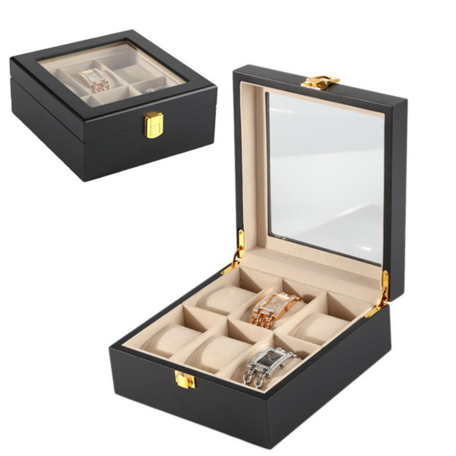 Matt fekete színű fa óratartó, óradoboz 6 óra számára. Arany színű zsanérok, belseje világos színű mikroplüss.